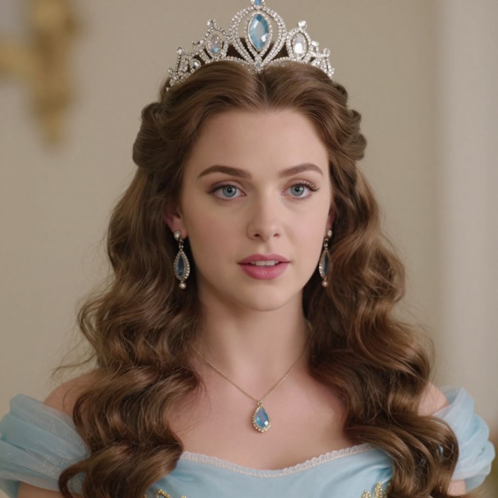 Photograph of a young woman with fair skin, blue eyes, and long, wavy brown hair, wearing a silver tiara adorned with a blue gemstone. She has on a light blue, off-the-shoulder, tulle dress with a matching blue teardrop pendant necklace. Her earrings are also teardrop-shaped with blue gemstones. She looks directly at the camera with a slight, confident smile. The blurred background is beige with a hint of golden decor on the left. The overall style is reminiscent of a fairytale princess, with soft, elegant lighting highlighting her delicate features.