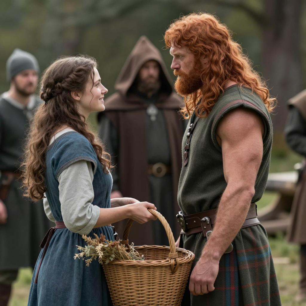 Scene with a red-haired woman in a yellow dress and green earrings, facing a muscular man in a striped shirt. Background includes shirtless men in armor, one with a helmet, and a bald man in a blue and red robe. Stone building with arched doorway in the background. Six people in total. Woman has curly hair, red lipstick. Intense expressions on men's faces. Medieval setting.