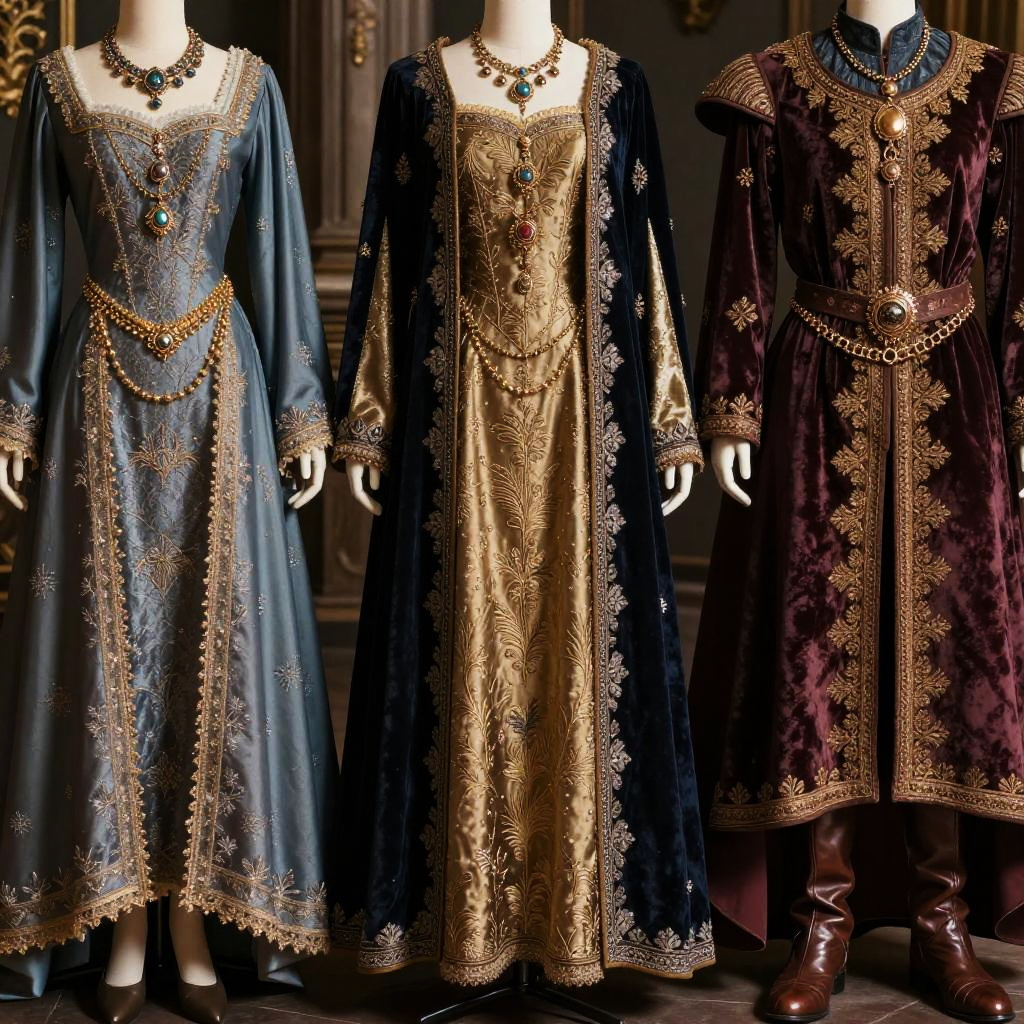 Kazakh dress arranged on a mannequin, featuring classic nomadic motifs in vibrant orange, green, and cream, heavy embroidery and ornamental silver belt, set inside a decorated yurt interior with traditional carpets and wooden furniture, warm lighting