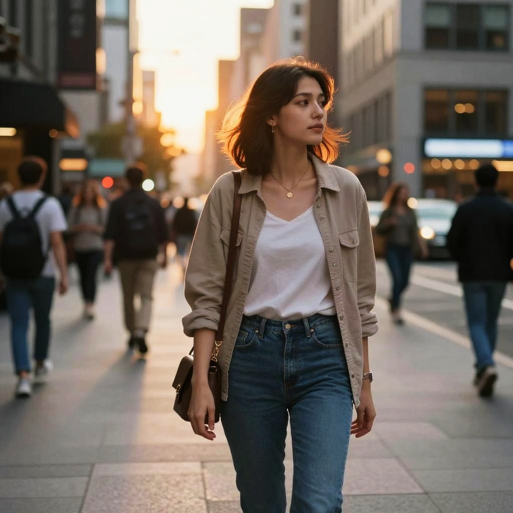 Photograph of a young blonde woman with wavy hair, wearing a short, white, off-the-shoulder dress and white sandals, standing on a sunlit urban street. She holds a black smartphone in her right hand and carries a small white handbag on her left shoulder. The background shows a busy street with blurred pedestrians, storefronts, and buildings. The woman stands slightly to the left of the center, smiling, and the street's pavement is gray with rectangular tiles. Sunlight casts shadows, adding a bright, airy feel to the scene.