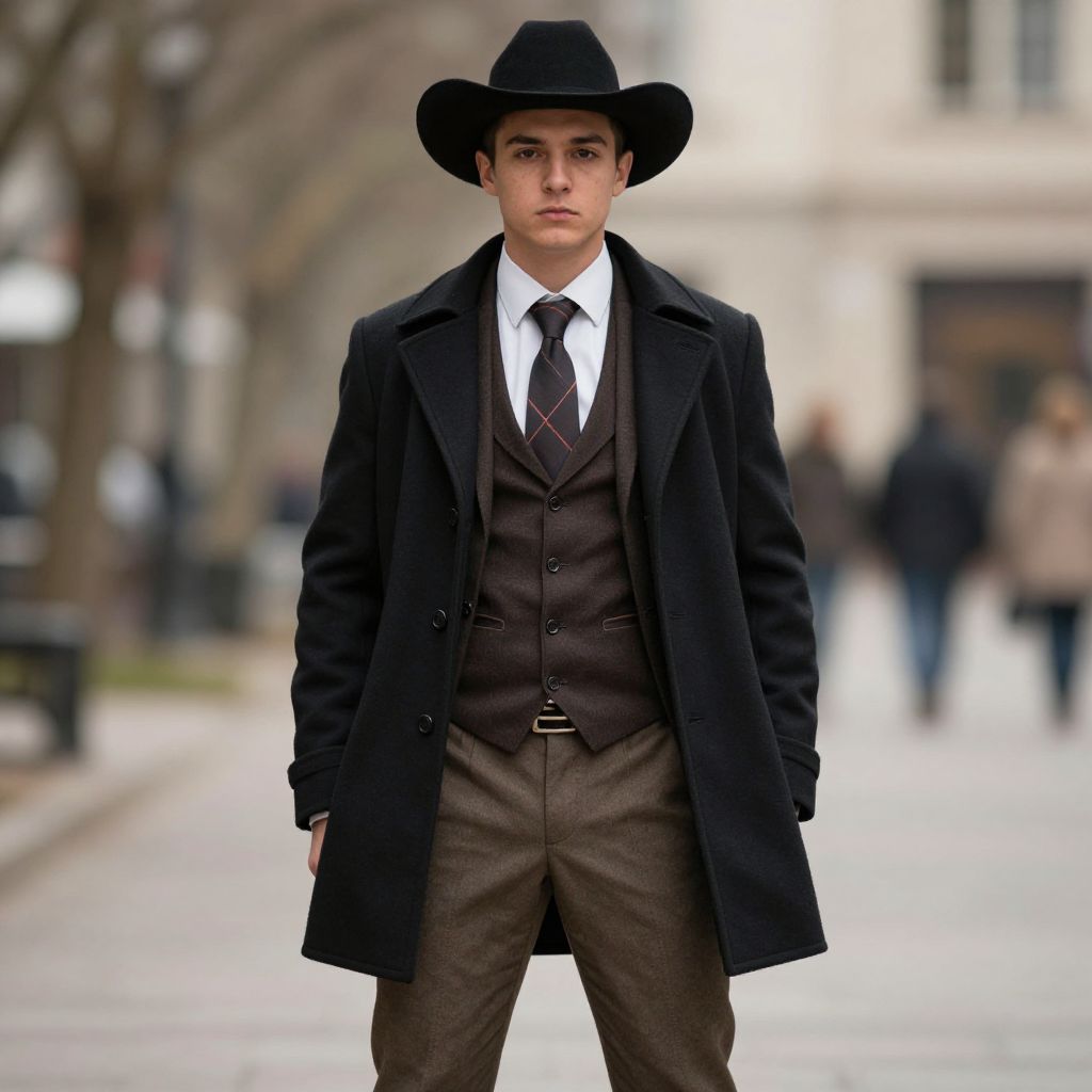 Photograph of a young man standing outdoors, wearing a dark brown cowboy hat, white dress shirt, and brown vest with black buttons. His facial expression is neutral, and he has short, dark hair. The background is blurred, featuring a tree-lined street with indistinct houses and greenery, suggesting a suburban setting. The man's stance is relaxed, with his right hand in his pocket. The contrast between the white shirt and brown vest highlights his outfit, giving a classic western look. The lighting is natural, suggesting daytime.