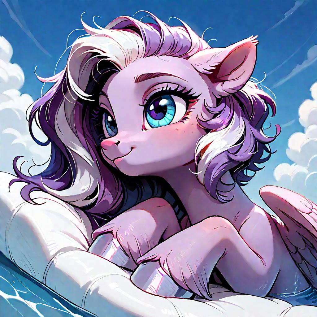 Score_9, score_8_up, score_7_up, score_6_up, score_5_up, score_4_up, source_pony, pegasus, female, feral, my little pony, pale purple body, wings, feathers, feathered wings, friendship is magic, two toned mane, two toned tail, purple hair, white hair, purple tail, white tail, blue eyes, fan character, hair, fur, solo, pony, detailed background, quadruped, fetlocks, shoulder length hair, quadrupedal, in a pool, show accurate, my little pony:the movie, lying on a cloud, messy mane