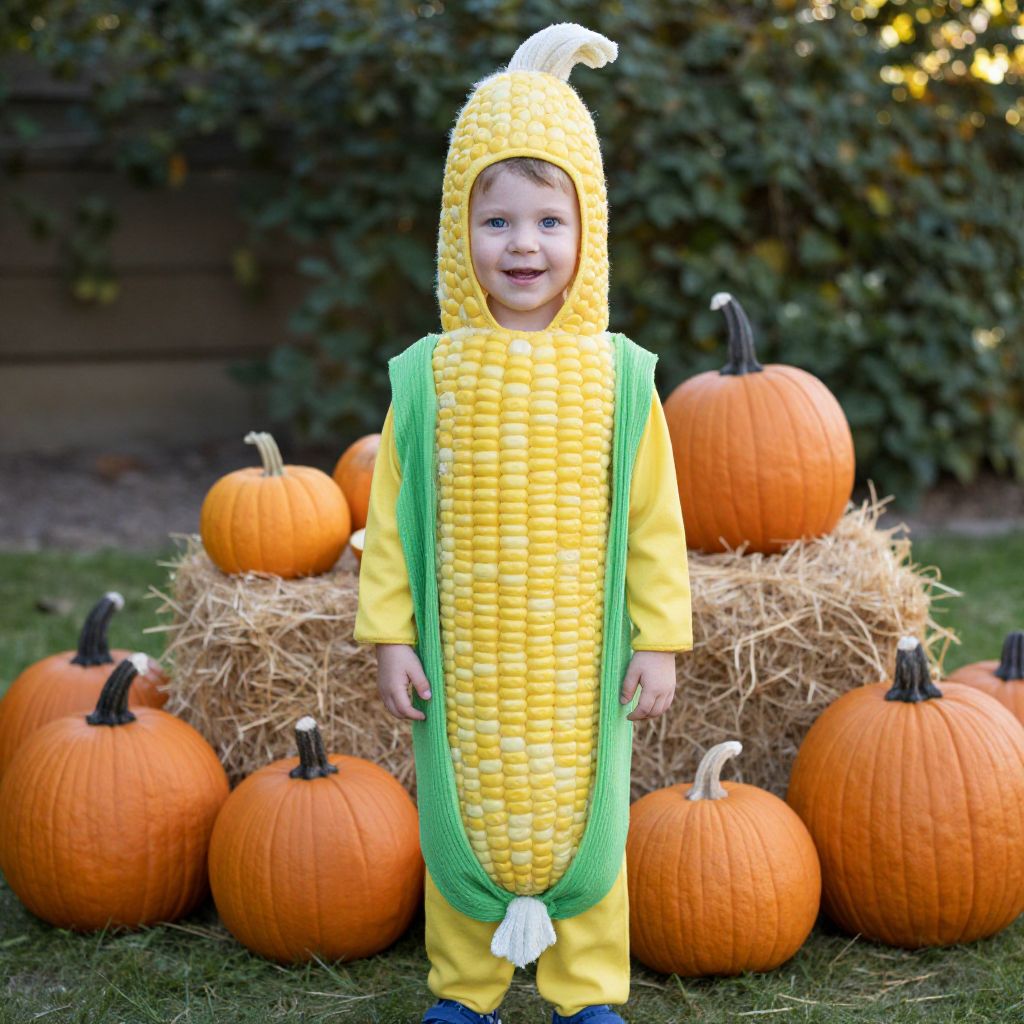 Child in Corn Cob Costume with Pumpkins