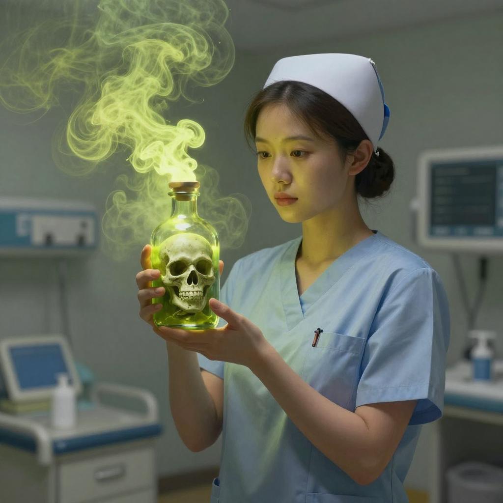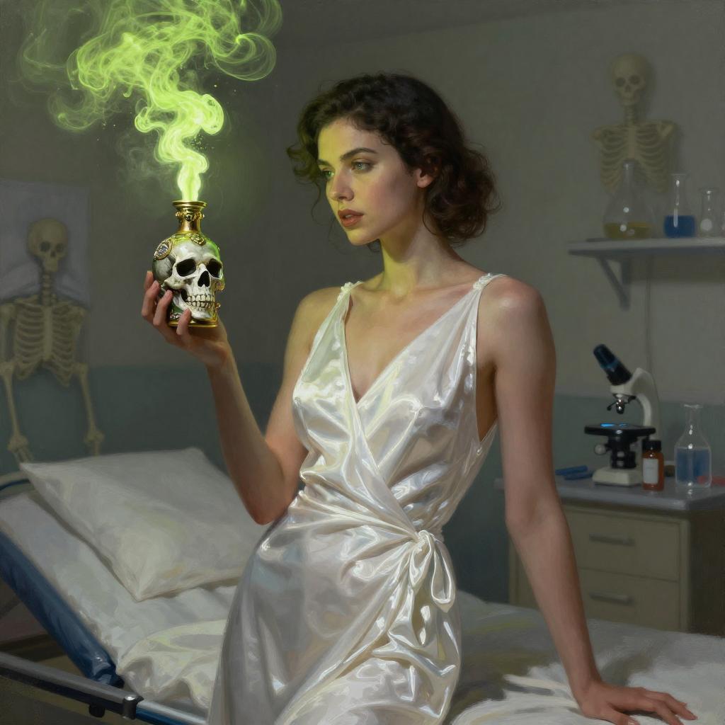 Patient woman in quarantine hospital ward holding an ancient skull-shaped vial with bubbling poison inside, with bright luminous green smoke forming animated holographic skeletons in the air, patient woman is wearing a silky hospital nightgown, glamour photograph, digital painting, high resolution