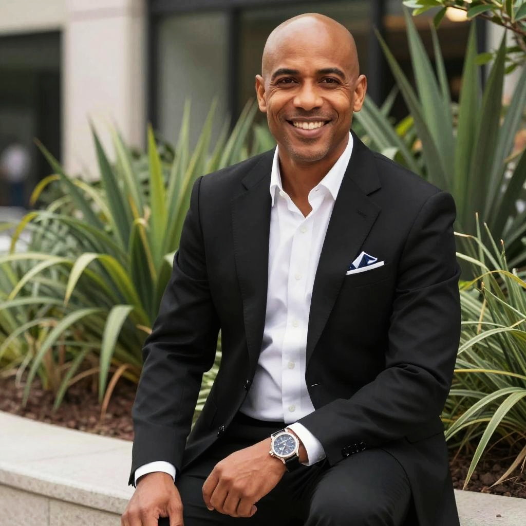 A smiling bald man wearing a stylish black suit and white shirt is sitting outdoors amidst lush green plants. His confident pose is complemented by two wristwatches and a pocket square, set against a modern urban backdrop. The portrait showcases a blend of contemporary fashion and natural elements.