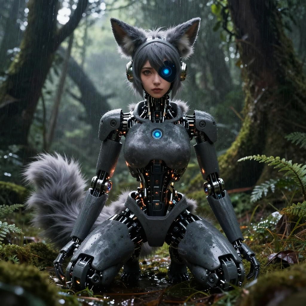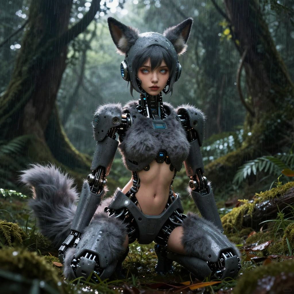 Uploaded on e621, by Alena Aenami, by Kenket, by Pino Daeni, by Ruan Jia, by Ross Tran, by Michael & Inessa Garmash, by Bypbap, solo female (((slate gray cybernetics robot protogen))) with (((protogen display head))) and (fluffy ears) and (neck tuft) and (claws) and ((clear eyes)), ((full-length portrait)), , (detailed Ross Tran anthro [robot] protogen), (detailed lighting), (detailed fur), (detailed skin), ((sitting at rainforest on starry night)), (cinematic lighting), ((detailed background)), ((looking at viewer)), (((front view))), (((fluffy))), (half body shadow), [backlighting], [crepuscular ray], [detailed ambient light], [gray natural lighting], [ambient light on the belly], (higher wildlife feral detail), [realistic proportions], [explict content], [sharp focus], (questionable content), (shaded), ((masterpiece))