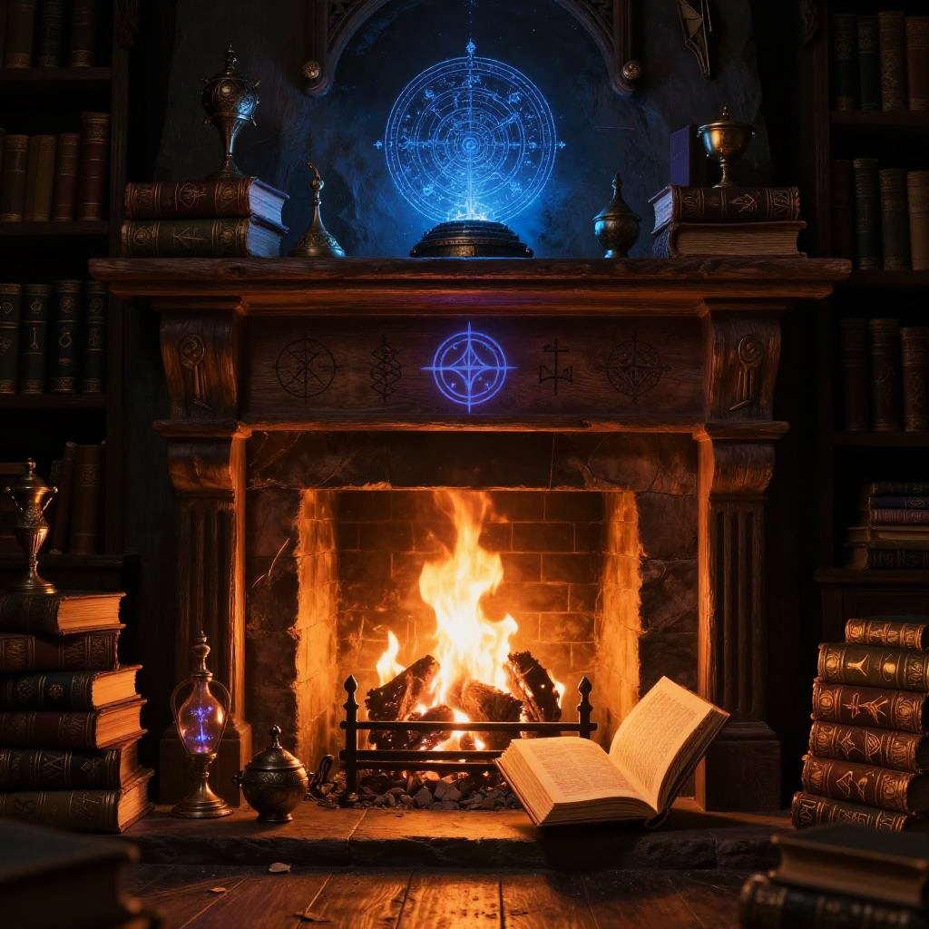 A fantasy-inspired scene of reading by the fireplace in a wizard’s study, magical artifacts glowing softly, ancient tomes on shelves, enchanted flames casting blue and orange hues, mystical symbols etched into the wooden mantel, creating a mysterious and captivating ambiance.