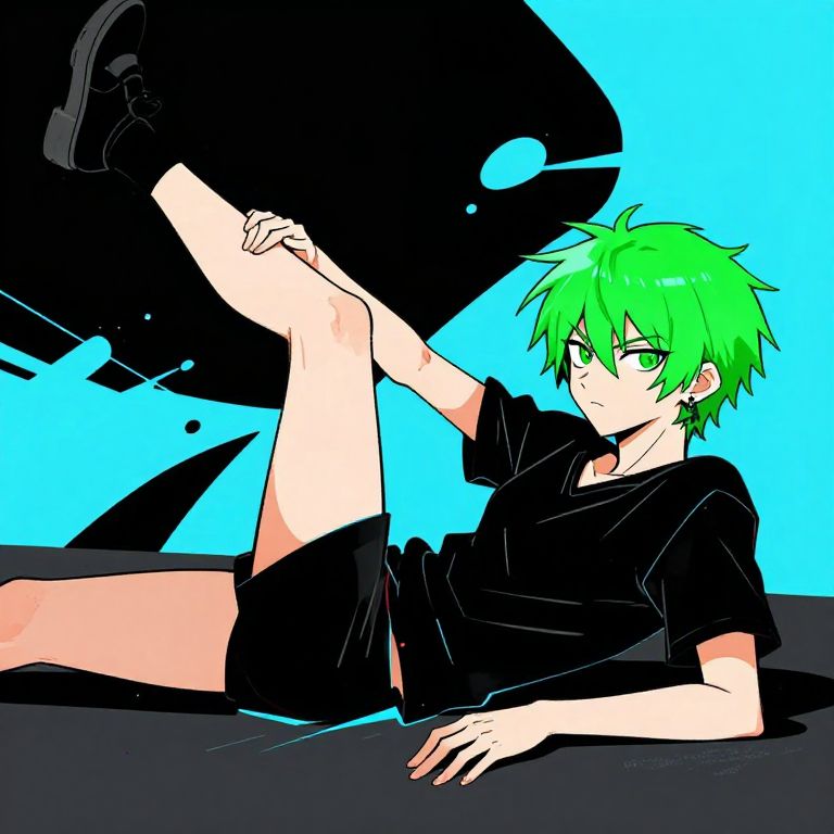 Digital anime-style drawing of a green-haired boy in a black t-shirt and shorts, lying on his back with one leg raised, against a bright blue