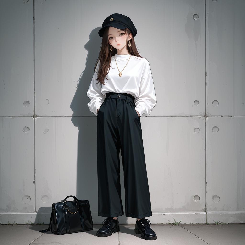 Full-body image of a young woman with long black hair and black eyes, standing against a weathered wall with shadow cast behind her. She wears a red long-sleeve shirt, high-waisted black pinstriped pants, shiny black shoes, and a black hat. She accessorizes with a gold necklace and hoop earrings, hands casually placed in her pockets, looking confidently at the viewer.