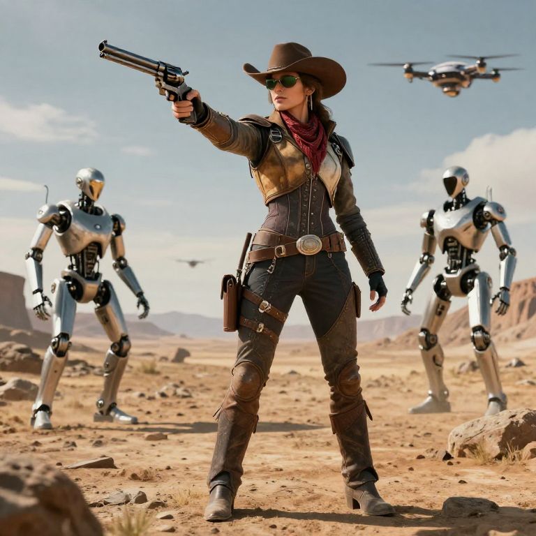 Photograph-style digital art depicts a confident woman in a brown cowboy hat and leather outfit, holding a gun aimed forward. She has sunglasses, a red bandana, and a belt with a holster. Her attire includes brown pants and boots. Behind her, two humanoid robots with silver and black armor stand in a desert landscape with rocky terrain and a clear blue sky. A drone hovers in the background. The woman stands in the center, with the robots flanking her sides, creating a dynamic and action-packed scene. The image combines Western and sci-fi elements.