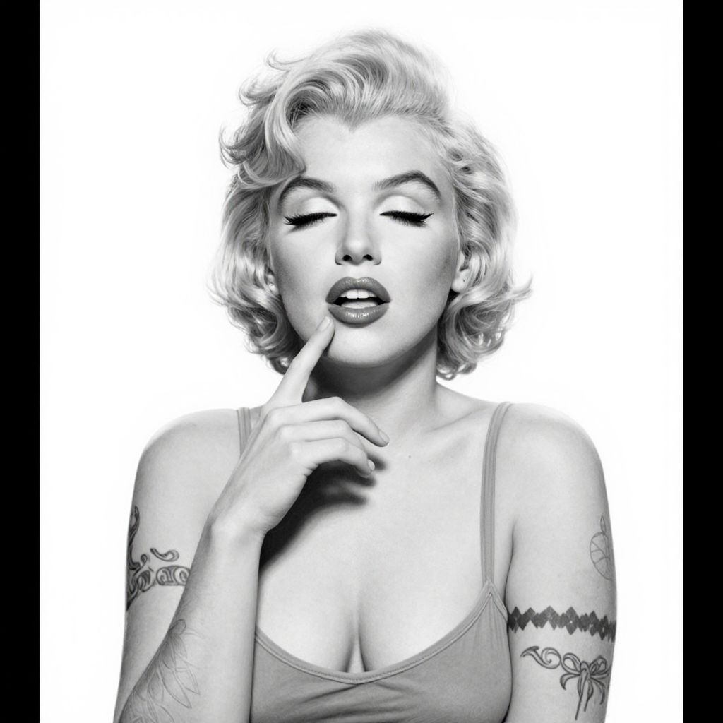 This is a black-and-white digital drawing of a vintage-style woman with short, wavy blonde hair, reminiscent of Marilyn Monroe. She has closed eyes, slightly parted lips, and is touching her chin with her index finger. Her shoulders and arms are adorned with detailed tattoos. She's wearing a low-cut top that reveals her cleavage. The background is plain white, making her the focal point. The art style is realistic with a touch of classic Hollywood glamour.