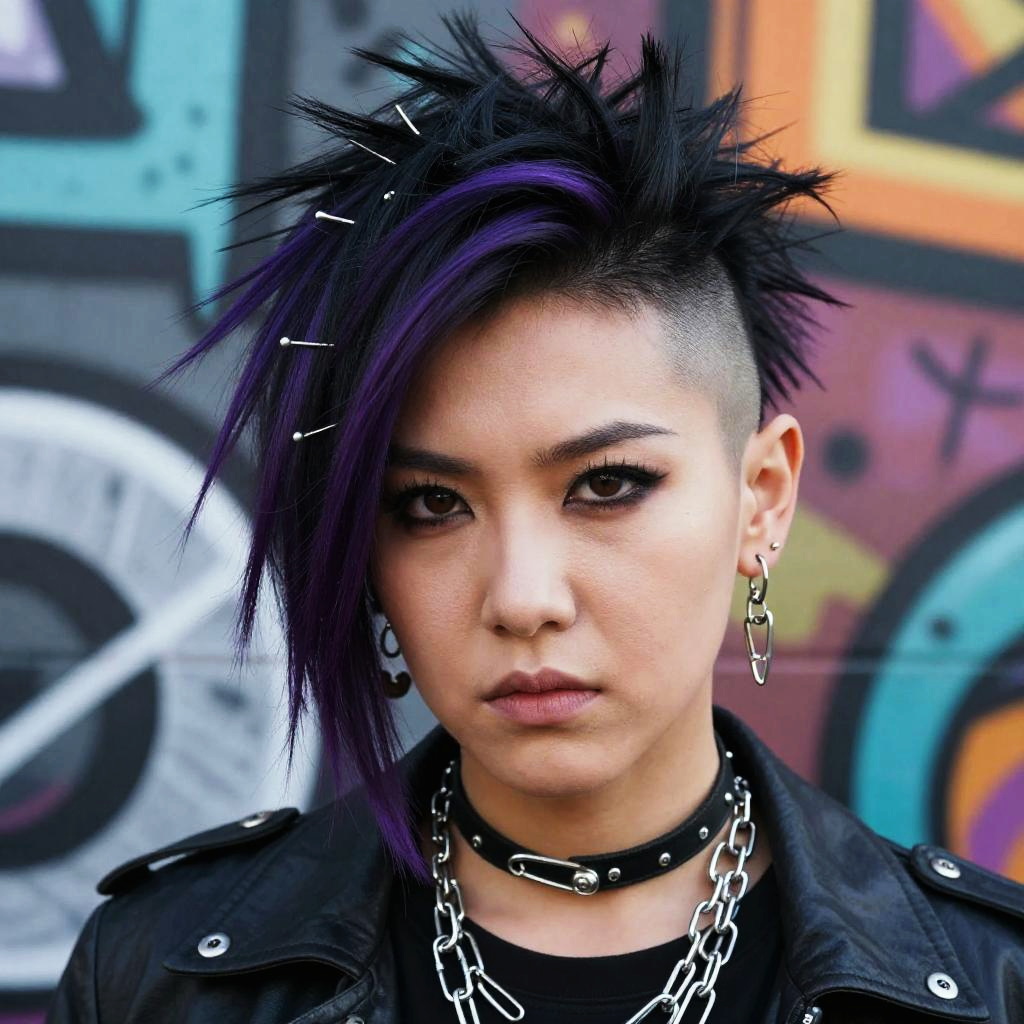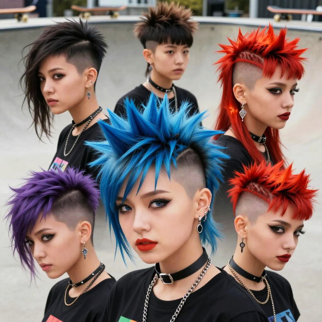 Punk girl haircuts showcasing a variety of iconic cuts like mullets, spikes and undercuts, mixed with colorful strands of electric blue and fiery red, streetwear with an attitude, skate park setting, dynamic pose, vivid digital painting