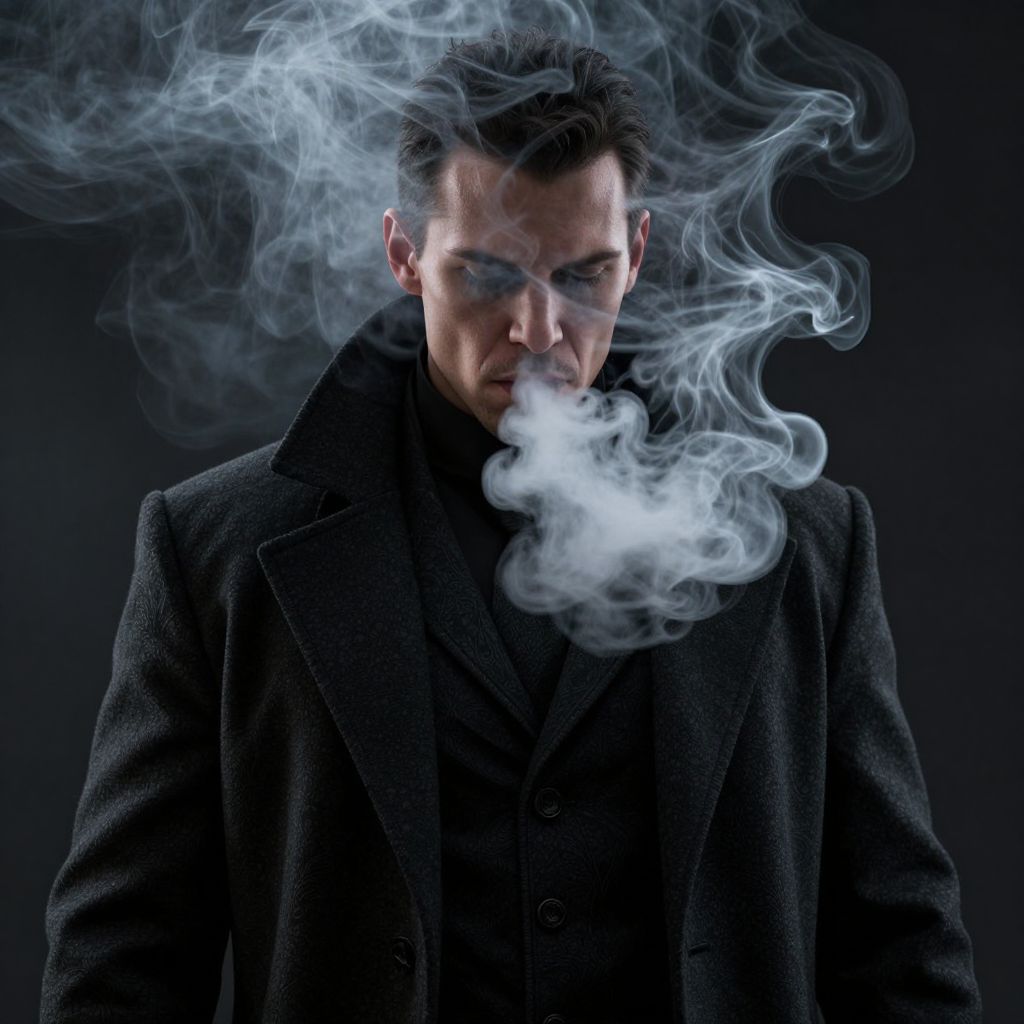 In this hyper-realistic, 3D-rendered image, a man exudes a dark and sinister aura as he exhales a thick cloud of smoke. His face is partially obscured by the billowing vapor, creating an enigmatic and mysterious atmosphere. The man is dressed in a dark, textured coat that contrasts sharply with the lighter, almost ethereal smoke surrounding him. The interplay of light and shadow accentuates the contours of his face and the intricate details of his clothing, adding depth and dimension to the scene. The overall composition is tightly framed, focusing on the man and the smoke, with no extraneous elements to distract from the central subject. The image is devoid of color, relying on the stark contrast between the man's dark attire and the white smoke to convey a sense of foreboding and tension.