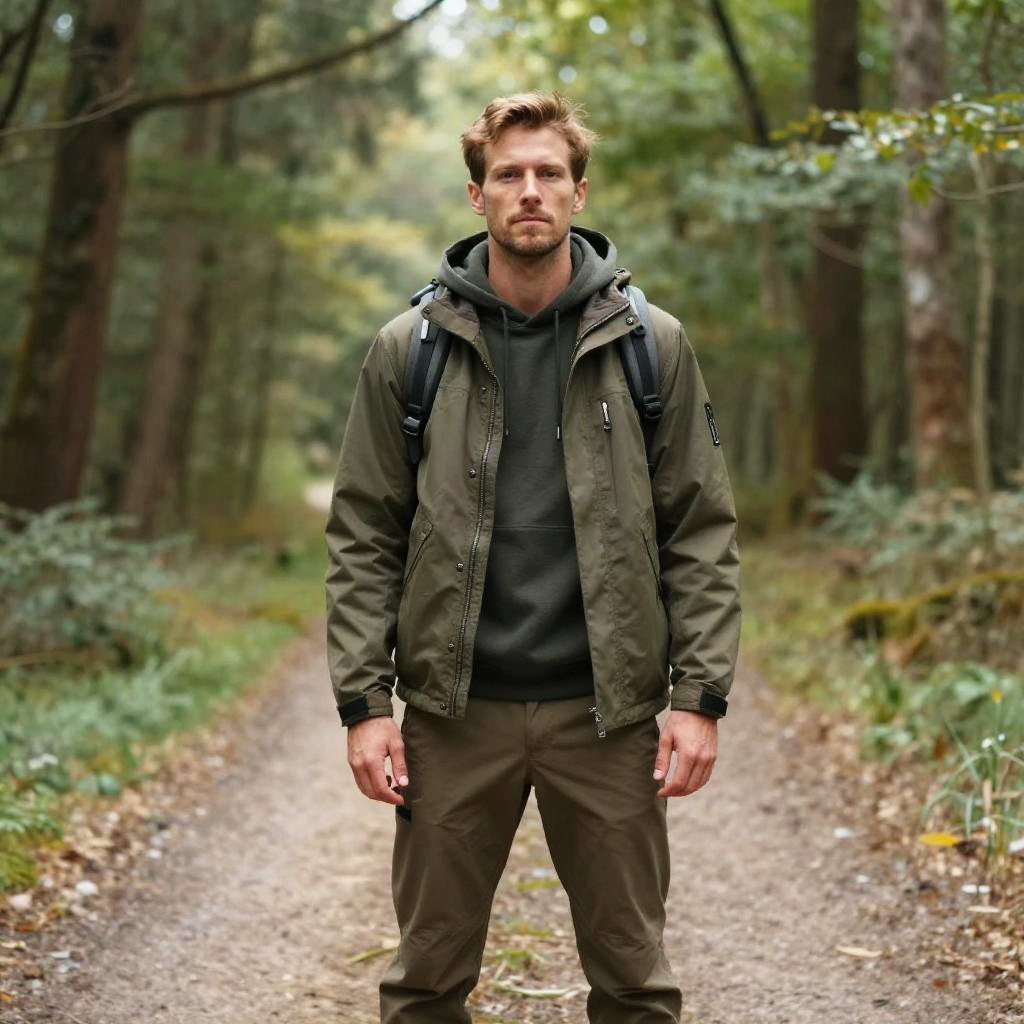 An artistic portrait of a man standing confidently on a forest path, dressed in outdoor gear, conveying a sense of adventure and exploration.