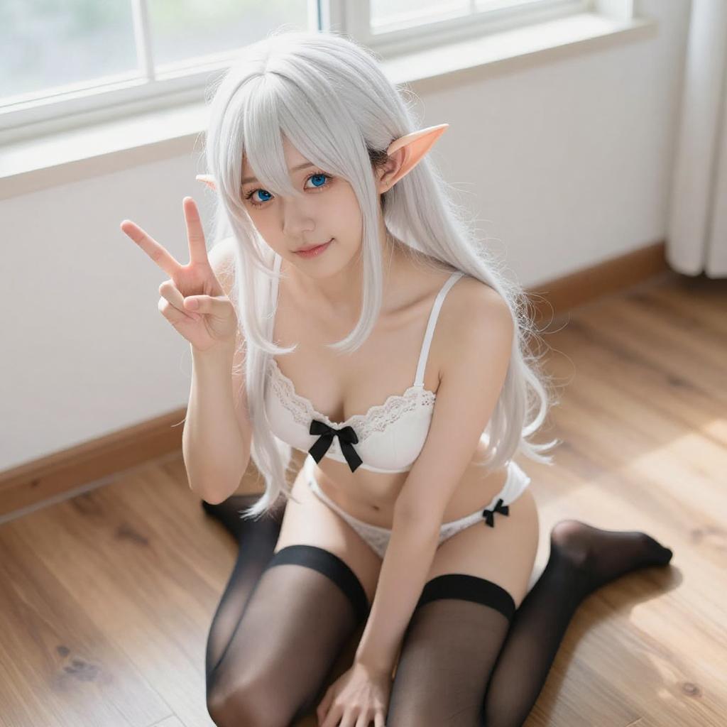 Photograph of an Asian woman with long white hair, elf ears, and pale skin, wearing a white lace bra and panties with black bows, and black thigh-high stockings. She is sitting on a wooden floor, making a peace sign with her right hand, and smiling with pink lipstick. The background includes white furniture and a bright window.