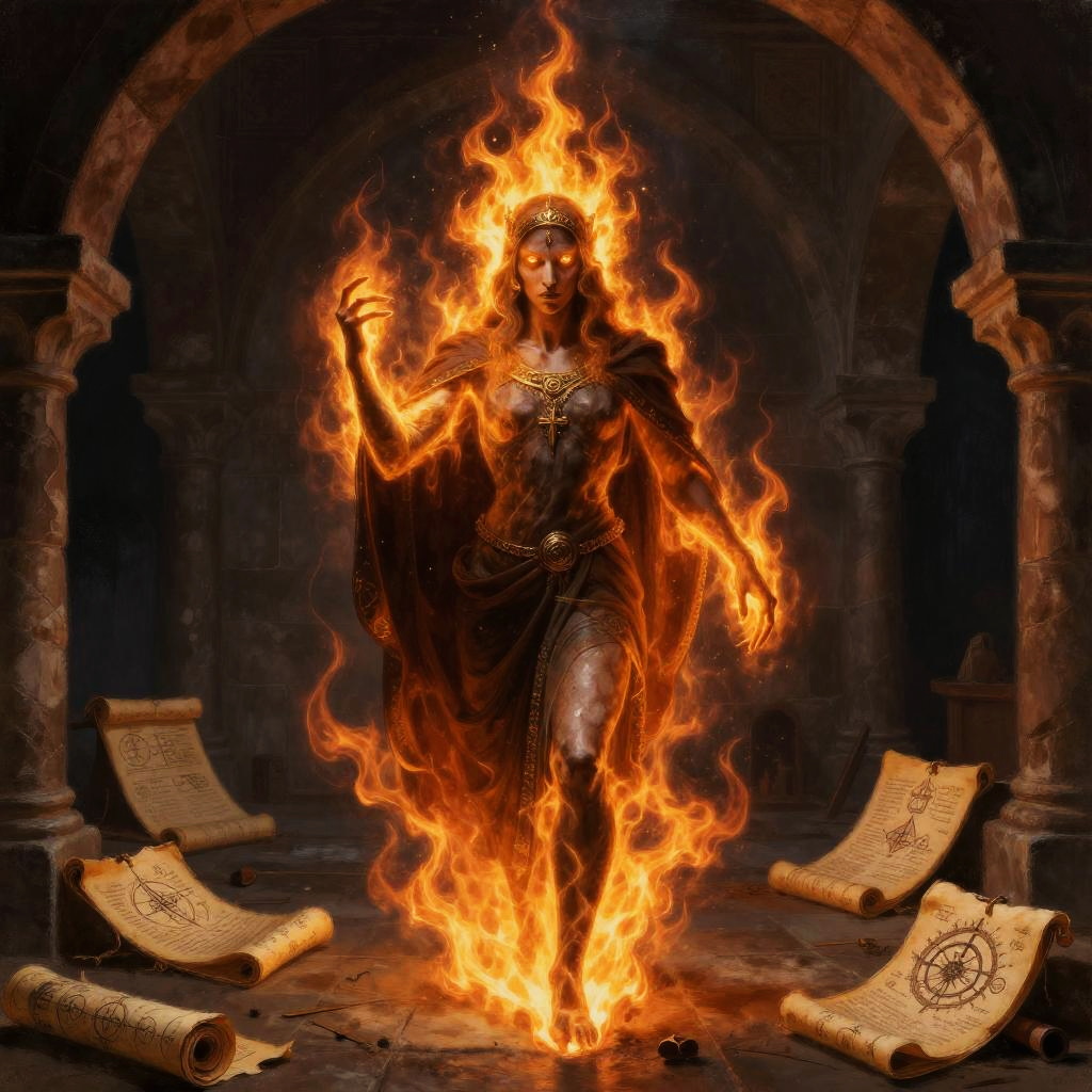 Demon painting medieval artwork, sinister figure with glowing eyes engulfed in ethereal flames, set in a dimly lit stone chamber, surrounded by old scrolls and arcane symbols