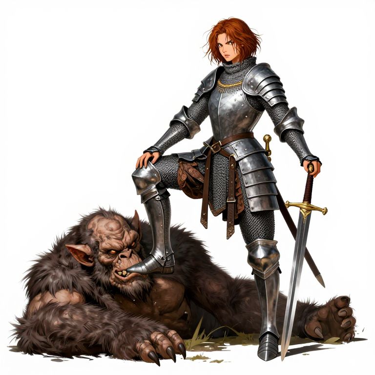 Niji Stan Katayama style Illustration by Jean-Claude Mézières of a fierce female medieval warrior wearing chainmail armor, she has frizzy auburn hair, she is standing beside the severed head of a giant troll laying on the ground, she rests one foot on top of the trolls head in victory, beside her there is a bloody sword sticking into the ground, she has one hand on top of the swords pommel