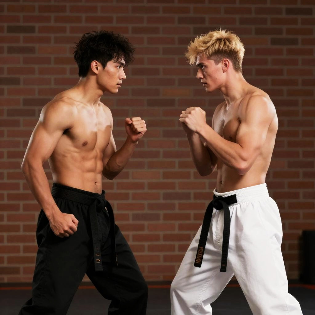 Two shirtless men in martial arts stances, facing each other. The man on the left has black pants, dark hair, and a focused expression. The man on the right has white pants, blond hair, and a tense expression. Brick wall background. Both have muscular builds.
