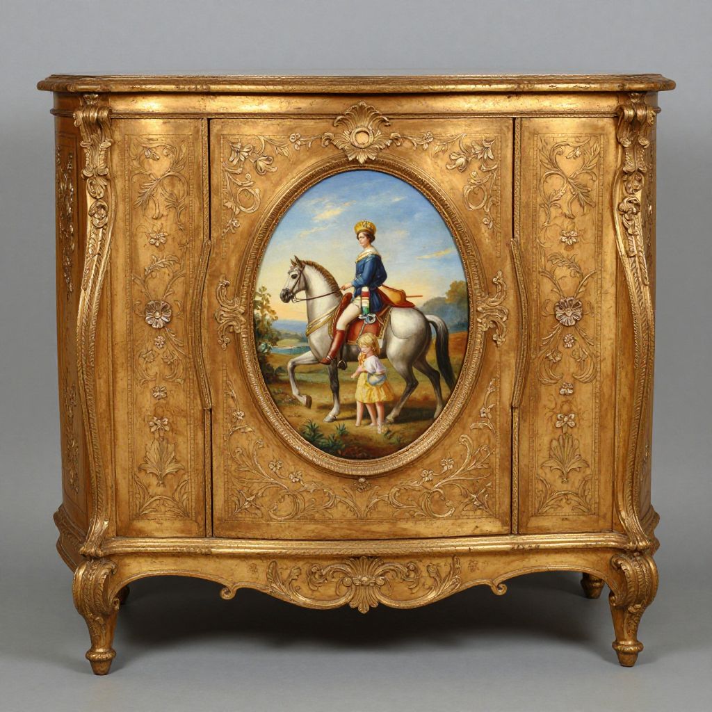 American Rococo Revival giltwood polychrome dressing table featuring ornate gold detailing, floral embellishments, and a central oval painting depicting a woman riding a horse accompanied by a child, set against a pastoral landscape.