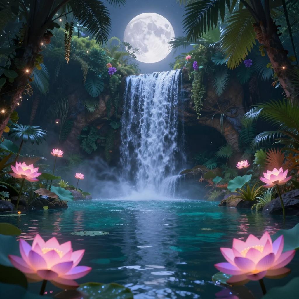 A surreal, magical landscape featuring a glowing waterfall cascading into a serene turquoise pool under a large luminous moon. Surrounding the water are lush tropical plants and glowing pink and purple lotus flowers, creating an enchanted forest atmosphere with sparkling lights and ethereal ambiance.