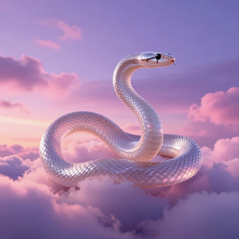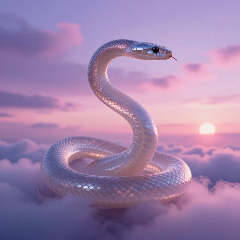 Digital artwork of a large, silver-white snake with a shiny, scales texture, coiled gracefully among pink and purple clouds against a twilight sky. The snake's head is raised, eyes narrowed, and its forked tongue slightly extends. The background features soft, fluffy clouds with a gradient from pink to purple, adding a dreamy, ethereal quality. The snake's reflective scales catch the light, creating a luminous effect. The overall style is hyper-realistic with a surreal, fantasy-like atmosphere.