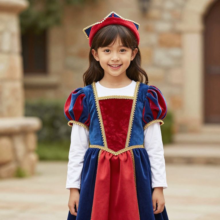 Photograph of an Asian child with short black hair, wearing a silver tiara with a red jewel. The child is dressed in a blue, puffed-sleeve, lace-trimmed dress with a red heart-shaped brooch on the chest. The dress has a white lower section and a flowing red skirt. The child stands in front of a blurred green foliage background with a white path. The child's expression is neutral, and the image has a soft, almost CGI-like quality.