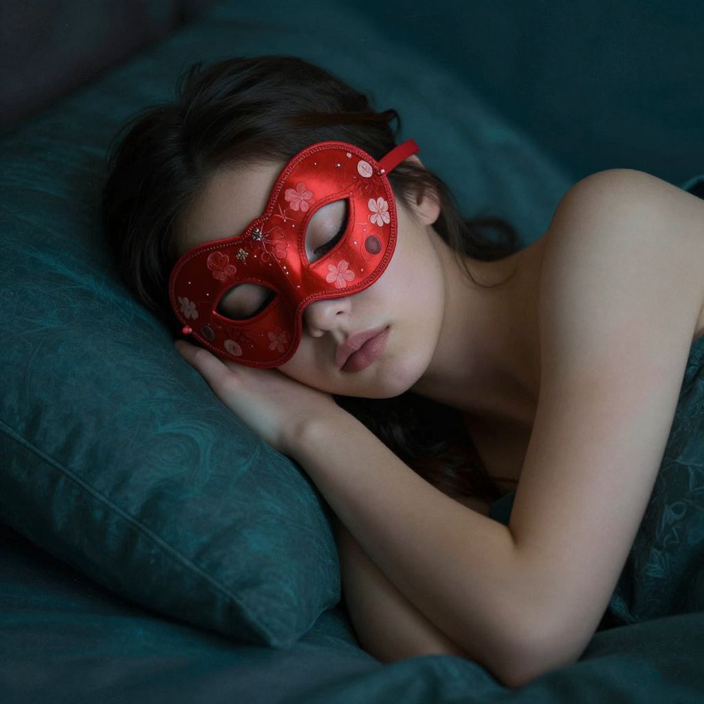 A digital artwork featuring a serene woman in slumber, adorned with a vibrant red heart-shaped mask embellished with floral patterns, set against a dark teal background with subtle texture, evoking a dreamy and romantic aesthetic.