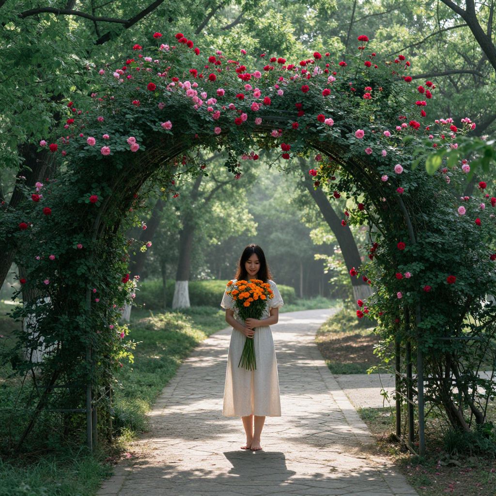 Photograph of an East Asian woman with straight black hair, standing in the center of a sunlit, tree-lined path. She wears a flowing white dress and holds a bouquet of vibrant orange flowers. She stands beneath a lush, arching rose trellis adorned with pink and red roses. The background features a sun-dappled forest with green foliage and a stone pathway extending into the distance. The image has a soft, ethereal quality, with dappled sunlight filtering through the leaves, creating a serene and romantic atmosphere.