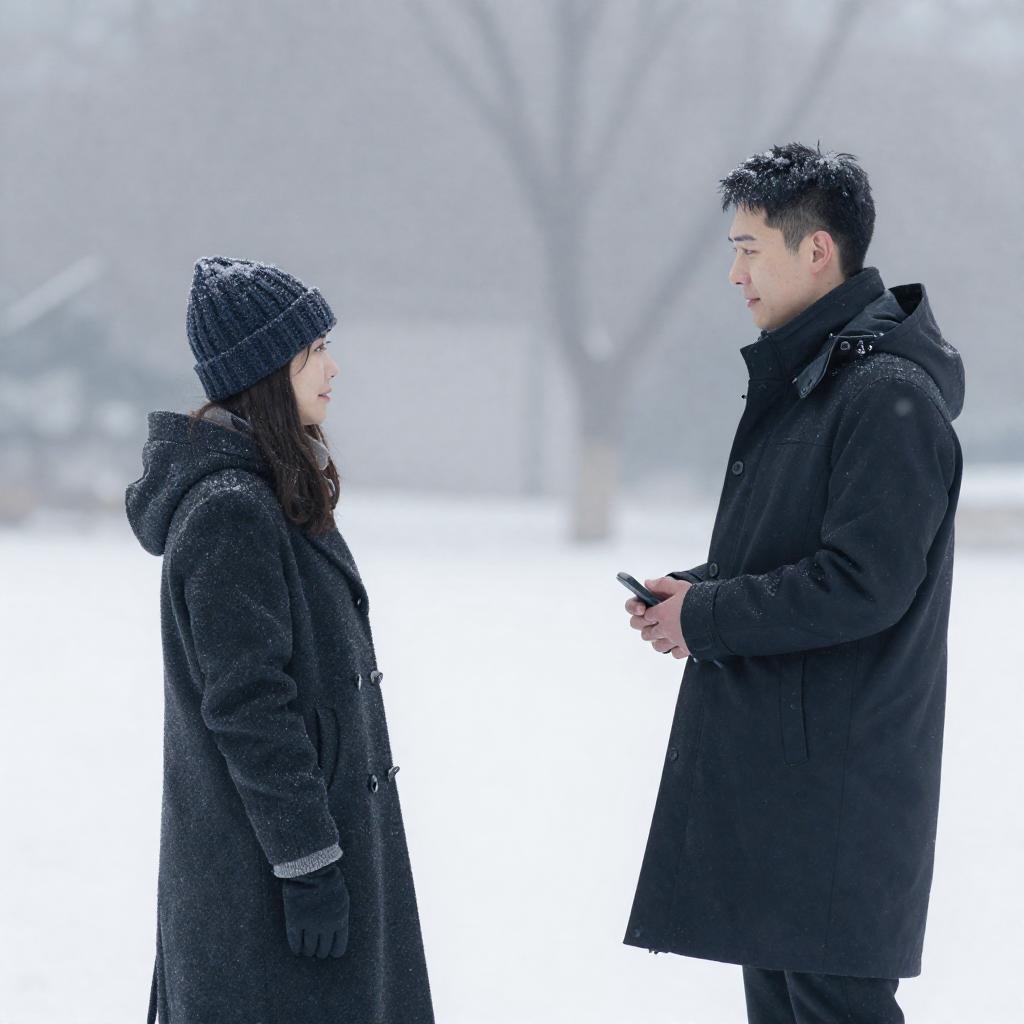 Photograph of two people, man and woman, boarding a train. Man in black jacket and pants, woman in black jacket with ponytail, both grabbing train door handles, leaning in. Train is gray with red lights, urban background. Man's face not visible, woman's face slightly visible, intense expression. Train on tracks, blurred buildings in background.
