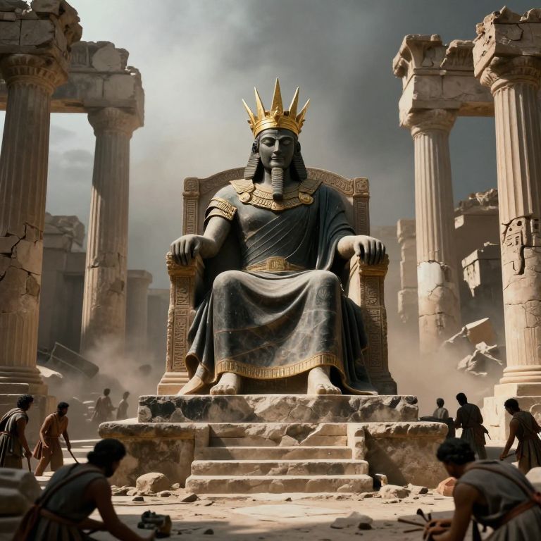 In the image, an ancient figure, possibly a king or a deity, sits regally on a stone throne amidst a crumbling temple. The figure is adorned with a golden crown featuring sharp, spiky elements, and is draped in flowing, dark robes. The throne is situated in the center of the scene, with columns and ruins surrounding it, suggesting a scene of decay and abandonment. The background is filled with a mix of light and shadow, creating a dramatic atmosphere. In the foreground, a group of people, possibly soldiers or workers, are engaged in various activities, adding a sense of movement and life to the otherwise still scene. The overall composition is balanced, with the figure as the focal point, and the ruins and people providing context and depth to the narrative.