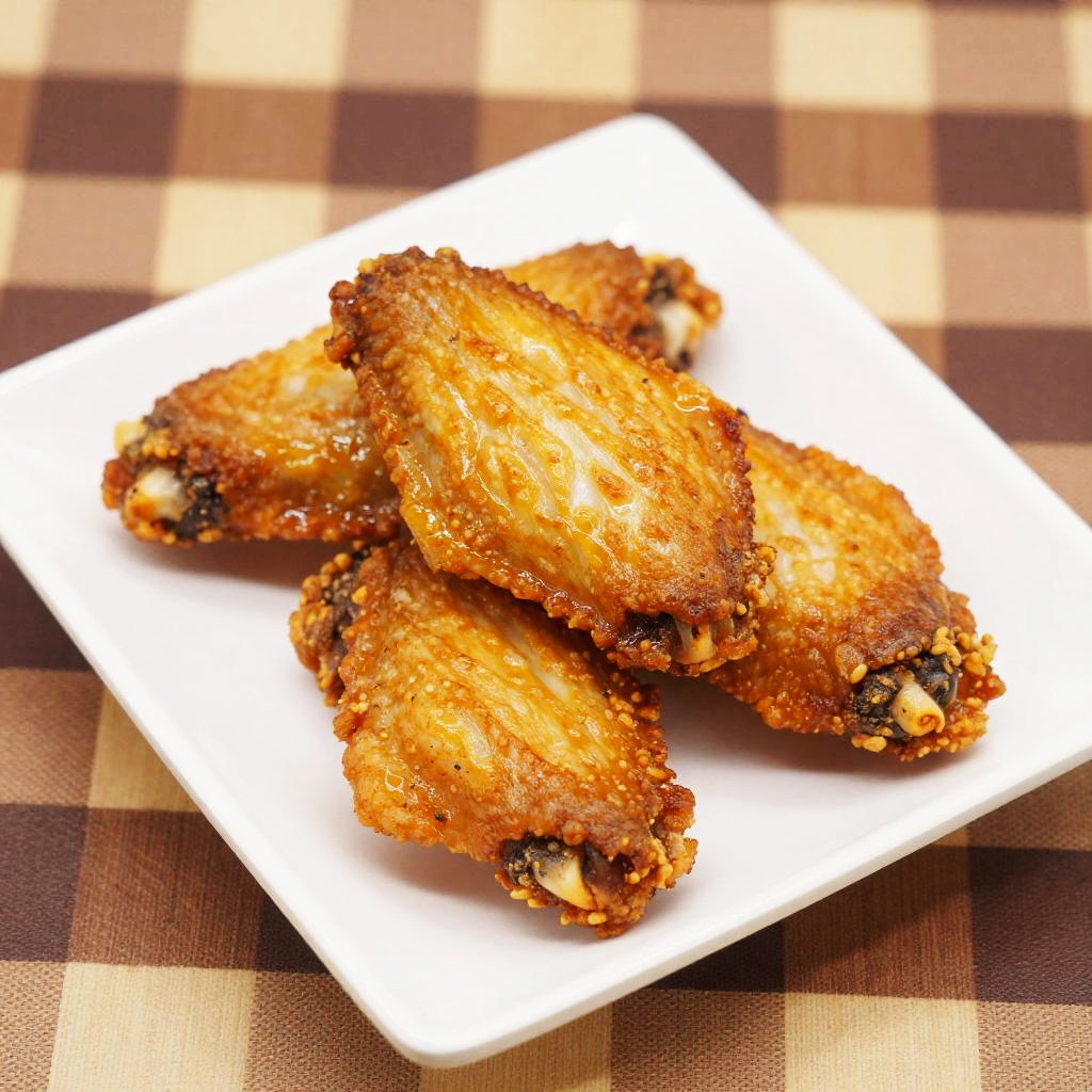 Photograph of three golden-brown, crispy fried chicken wings with a crunchy, textured coating, placed on a white square plate. The wings have visible breadcrumbs and seasoning, with slightly charred edges. The background features a brown and beige checkered tablecloth, adding a rustic feel. The lighting highlights the wings' crunchy texture and rich color. The image is sharply focused on the wings, with a soft, blurred background.