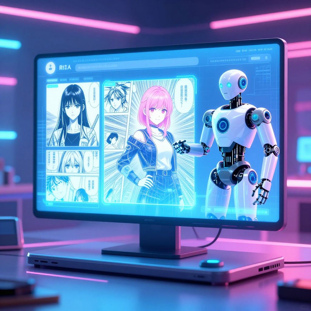 Ai manga generator interface, sleek high-tech device with holographic screens displaying manga characters, digital artist robot in anime style, bright neon blue and pink lighting, futuristic studio setting, intricate manga line art being auto-generated in real time