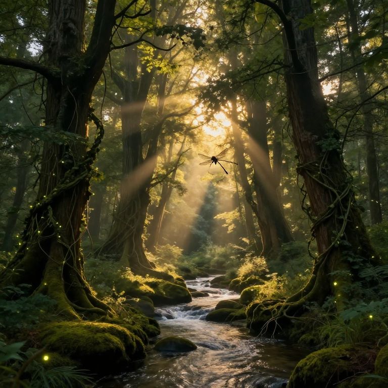 A panoramic landscape captures the surreal beauty of an enchanted forest bathed in the golden light of dawn, evoking a sense of serenity and wonder reminiscent of Romantic paintings. From a dragonfly's perspective, hovering just above a babbling brook, we gaze upon majestic ancient trees entwined with delicate vines and illuminated by glowing fireflies. The first rays of sunlight break through the dense foliage, casting long shadows that stretch across the mossy ground as the ethereal quality of this scene invites viewers to lose themselves in nature's timeless mysteries.