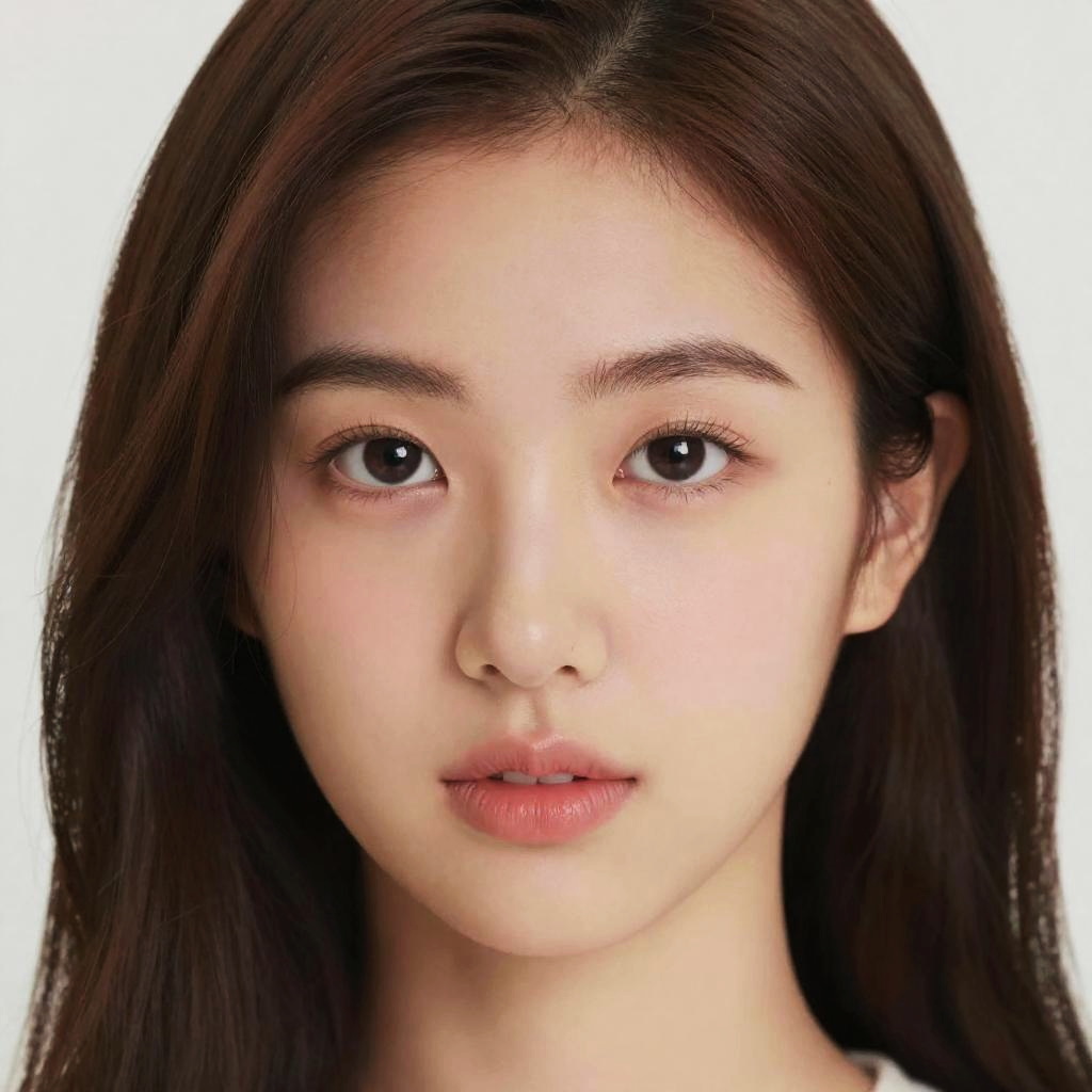 Photograph of an East Asian woman with straight, long black hair and fair skin. She has small, almond-shaped brown eyes, a subtle smile, and natural pink lips. Her face is centered against a plain, light gray background. The lighting is even, highlighting her smooth complexion and soft facial features. The image has a slightly blurry effect, adding a subtle, dreamy quality.