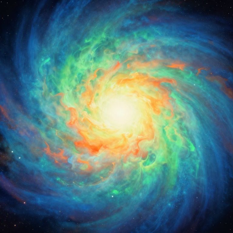 Photograph-like CGI image of a vibrant, swirling galaxy. At the center is a brilliant, white-yellow core surrounded by a dynamic, colorful spiral. The spiral features vivid hues of blue, green, and orange, with the blue and green forming a turbulent, wispy outer ring, and the orange blending into the central light. The background is a deep, star-speckled black, adding contrast to the galaxy's luminous colors. The image captures the galaxy's energetic and ethereal appearance, reminiscent of a cosmic storm.