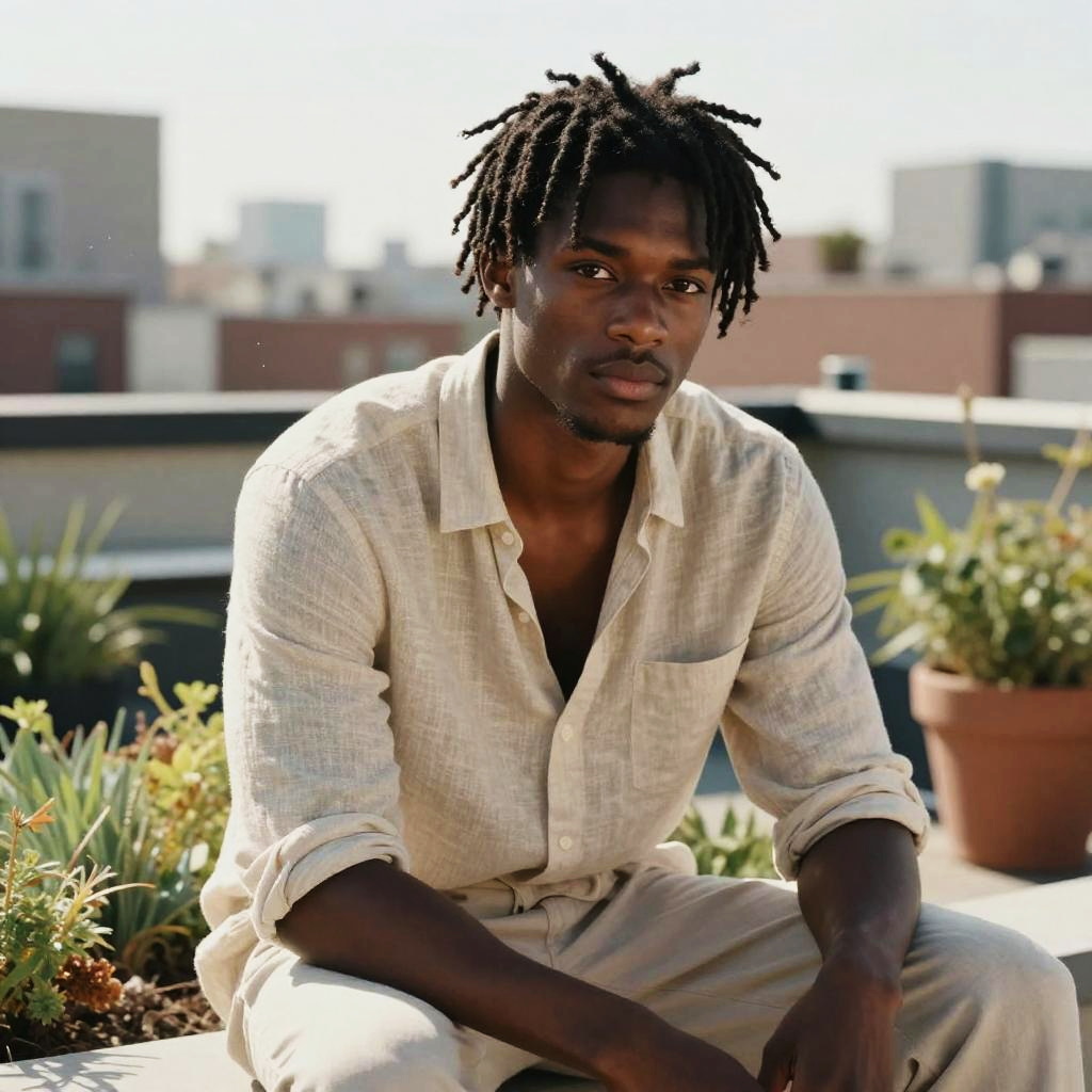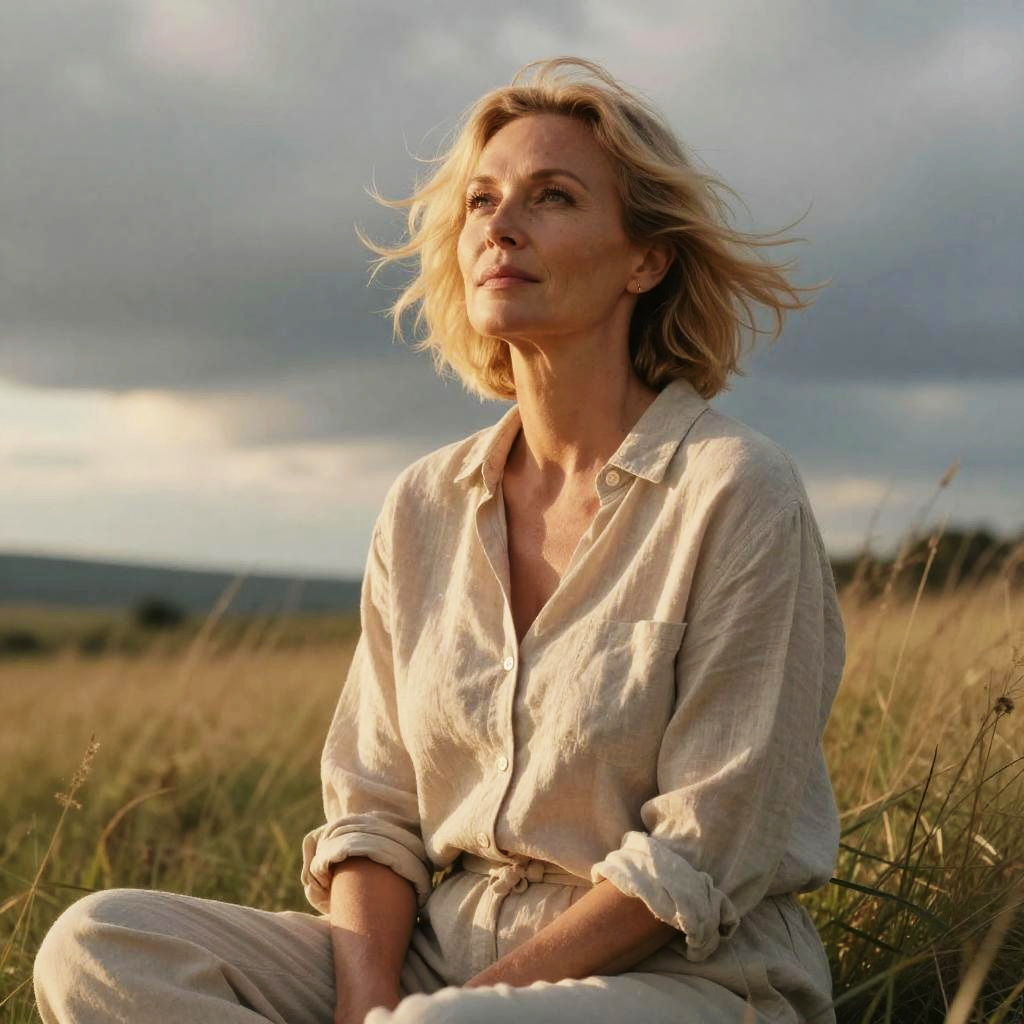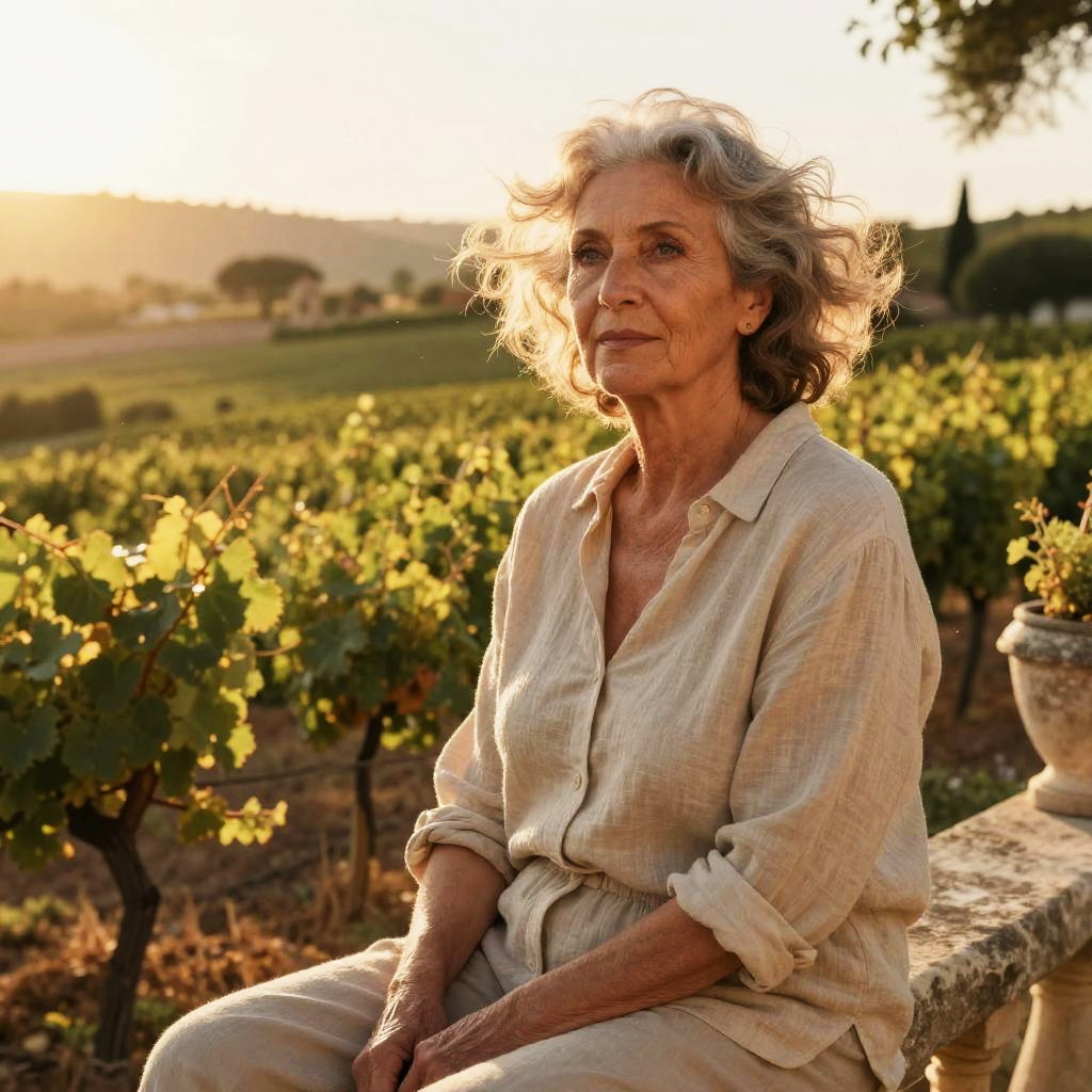 (masterpiece:1.1), best quality, (photorealistic:1.2), hyperrealistic, award-winning portrait of elderly woman with silver braided hair and wise, gentle eyes, upper body, expressive eyes, athletic-curvy build, wind-swept hair, seated in rustic countryside porch with blooming wildflowers, wearing a linen shirt and relaxed-fit pants, bathed in warm late afternoon glow with long shadows, soft particles in the air, 8k, highly detailed, broad lighting, chromatic aberration, subtle film grain, ray tracing, octane render, soft bloom