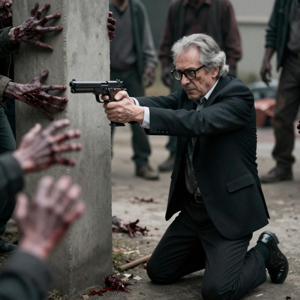 Old man with gray hair and glasses, wearing a black suit, aims a gun at zombie-like hands reaching from concrete structure. Several zombies with bloody hands surround him. He's kneeling, intense expression, gripping gun tightly. Background shows more zombies and blurred objects.