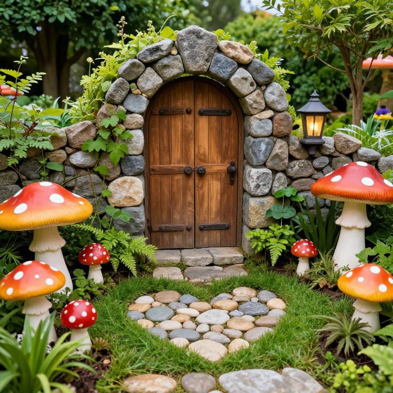 A whimsical fairy garden bursts to life with a charming stone archway leading to a wooden door, surrounded by enchanting mushroom-topped lanterns, lush greenery, and a heart-shaped pathway of stones and grass, inviting visitors into a magical, miniature world.
