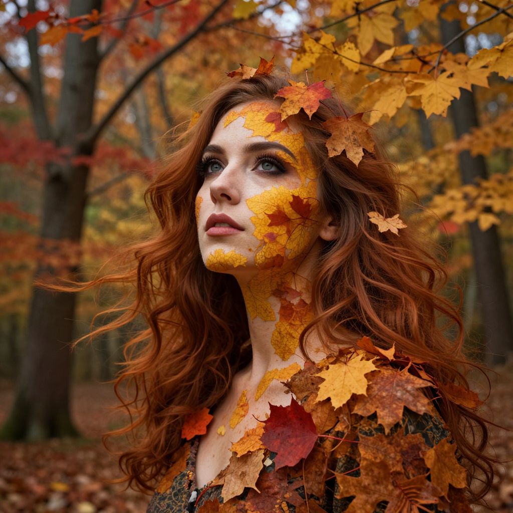 Photograph of a young woman with wavy, auburn hair standing in a forest during autumn. Her face and shoulders are covered in orange and red autumn leaves, blending with her natural features. She has fair skin and dark, expressive eyes, looking upwards with a serene expression. The background shows tall trees with colorful leaves in shades of orange, red, and yellow. The forest floor is covered in fallen leaves, enhancing the autumnal theme. The woman's outfit is partially visible, featuring a dark, textured fabric. The image has a vibrant, natural color palette and a soft, ethereal quality.