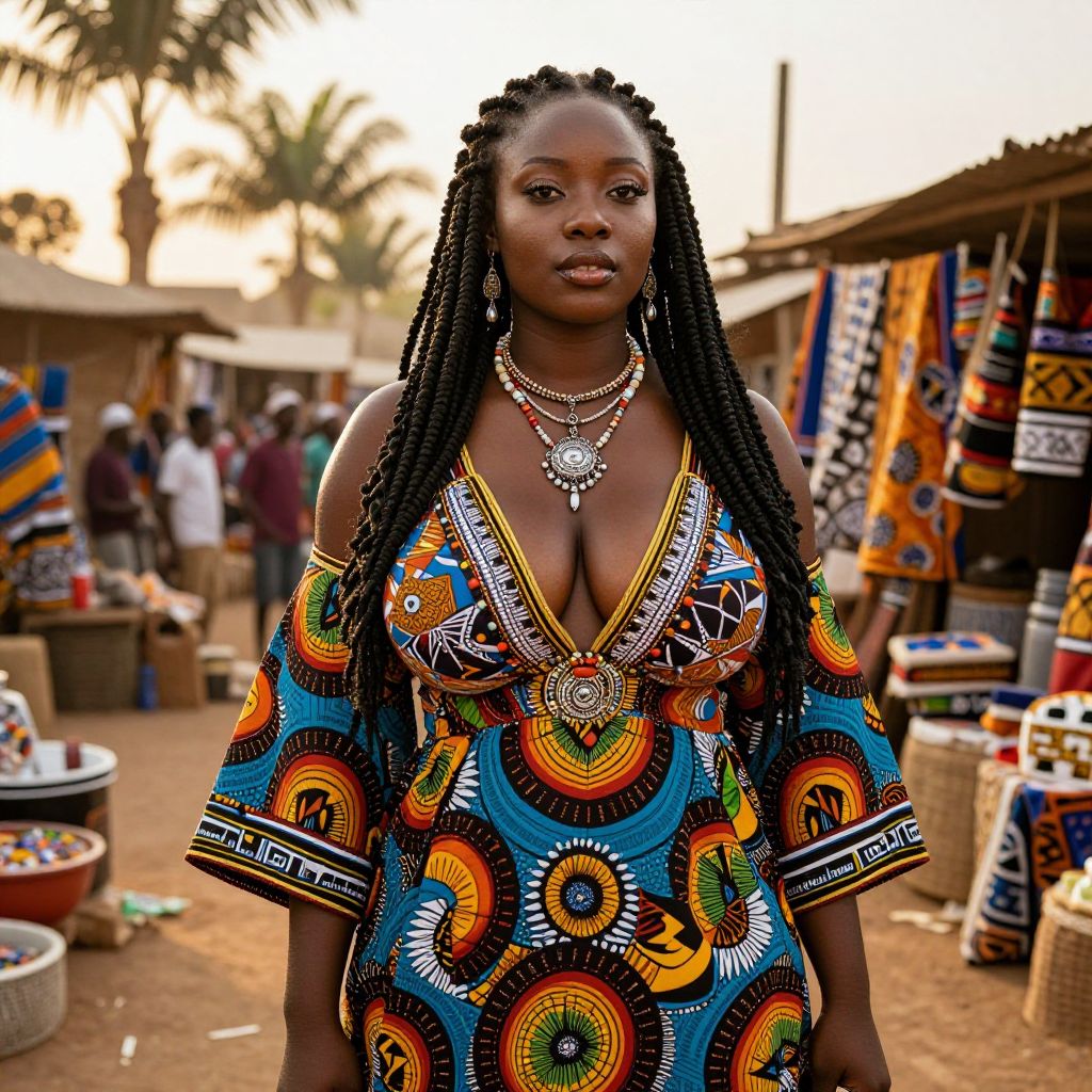 A beautiful African American woman with thick, flowing braids in her hair, wearing a traditional African outfit featuring vibrant, colorful patterns that showcase rich cultural heritage, a flowing embroidered dress with bold geometric designs, and a delicate necklace made of beads and metal accents around her neck. She has a confident, serene expression, big tits and sexy, standing in a sun-drenched marketplace with a warm, golden glow, the background filled with traditional African art and nature elements like palm trees and colorful textiles. The scene is lively, authentic, and full of cultural pride.