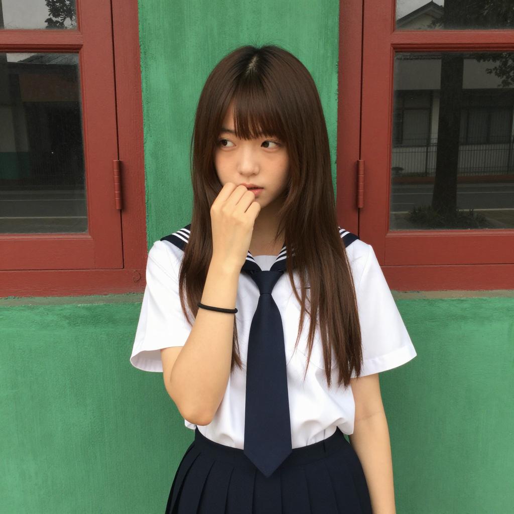 Asian woman with long brown hair, bangs, wearing a gray cardigan, white shirt, blue and white striped tie, standing against a concrete wall with yellow and black numbers. Her right arm is raised, hand touching her head. She has a neutral expression. Photo.