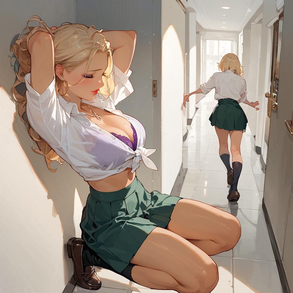 Score_9, score_8_up, score_7_up, score_6_up, source_anime 1girl, blonde hair, purple eyes, tan, hoop earring, necklace, cleavage, tied shirt, purple bra, midriff, green skirt, furrowed brow, happy, open mouth, arms behind head, hallway, black socks, loafers