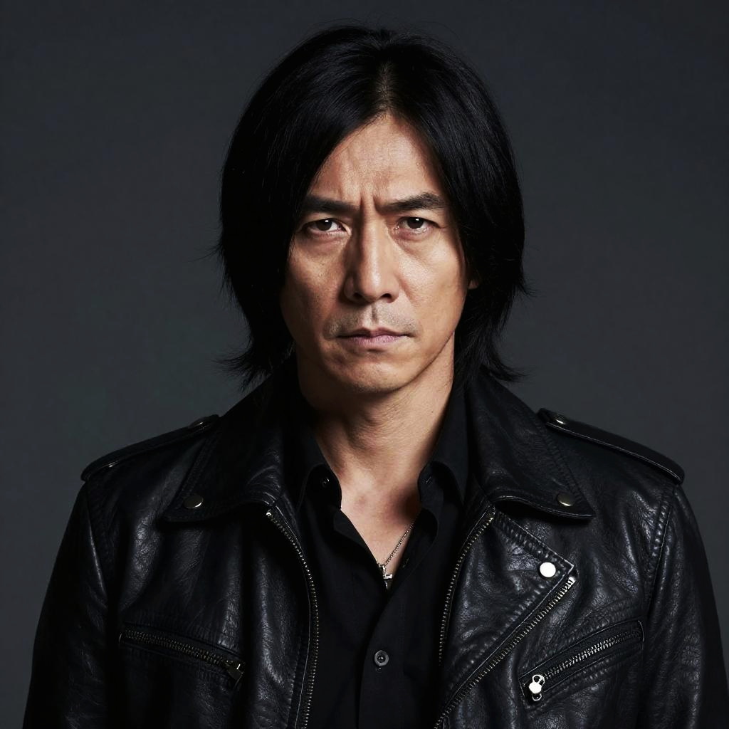 Photograph of a middle-aged man with long black hair, wearing a black cowboy hat, dark sunglasses, a white dress shirt, and a black vest with buttons. He stands against a plain, off-white background, exuding a confident, stylish demeanor. His expression is neutral, and the lighting highlights the contrast between his white shirt and black vest. The image is sharply focused with a slightly high-contrast, vibrant color palette.