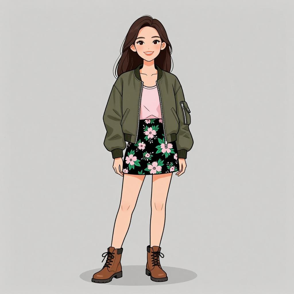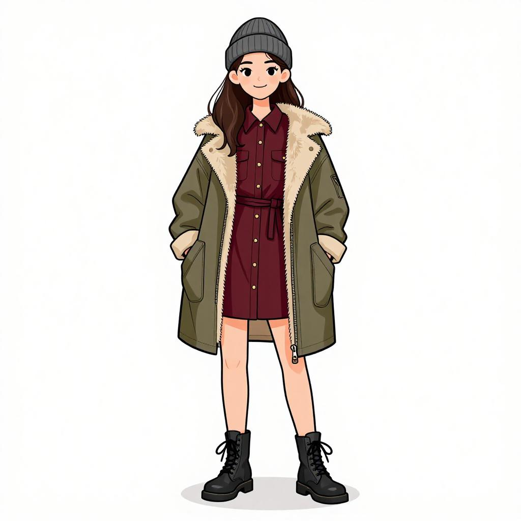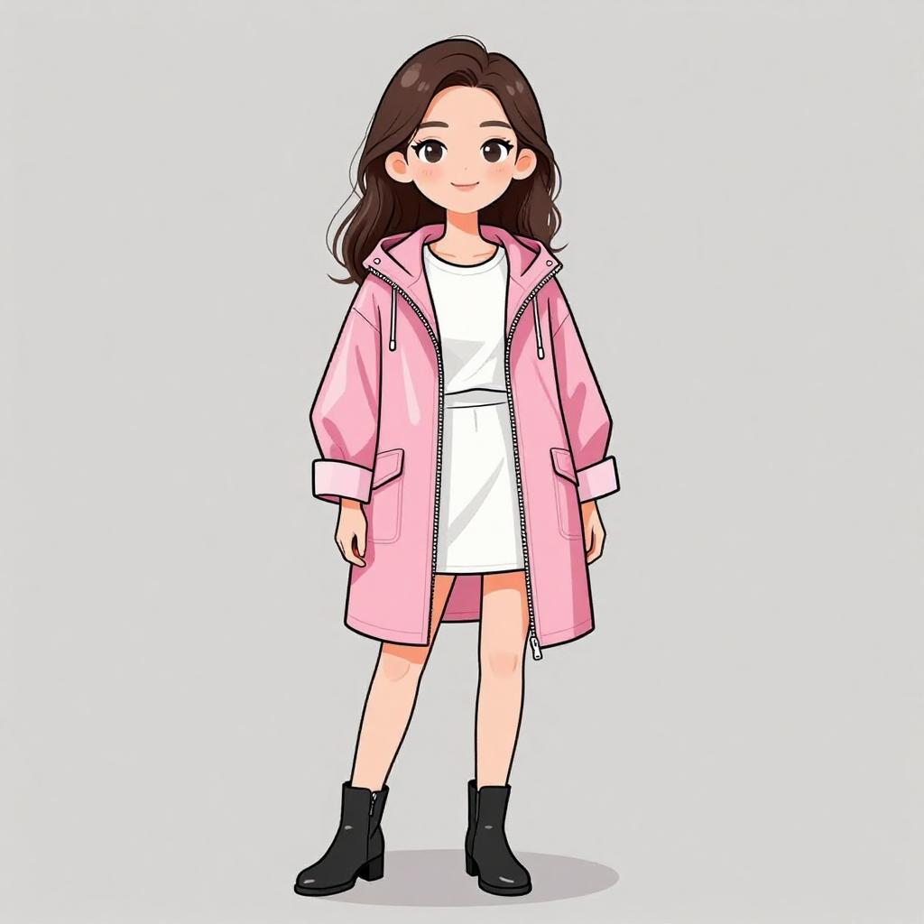 Woman with pretty face and pretty hair. smiling Woman, casual streetwear, glossy pink raincoat with hood, zip-up front, flap pockets, cuffed long sleeves, thigh-length, layered over a simple white dress, just above knee, black ankle boots with low heels, plain background. --sref 1467