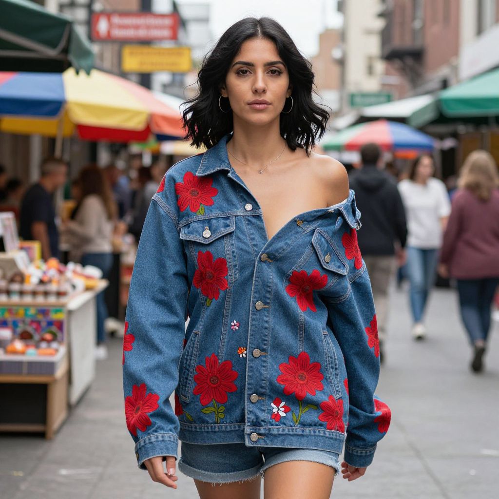 A fashion-forward woman with medium-length wavy black hair and a calm expression walks through a bustling outdoor market in a vibrant city, dressed in a bold single-shoulder denim jacket with a red floral pattern; the outfit is slightly oversized, the open shoulder creating a trendy, urban vibe against a backdrop of colorful stalls and street signs.