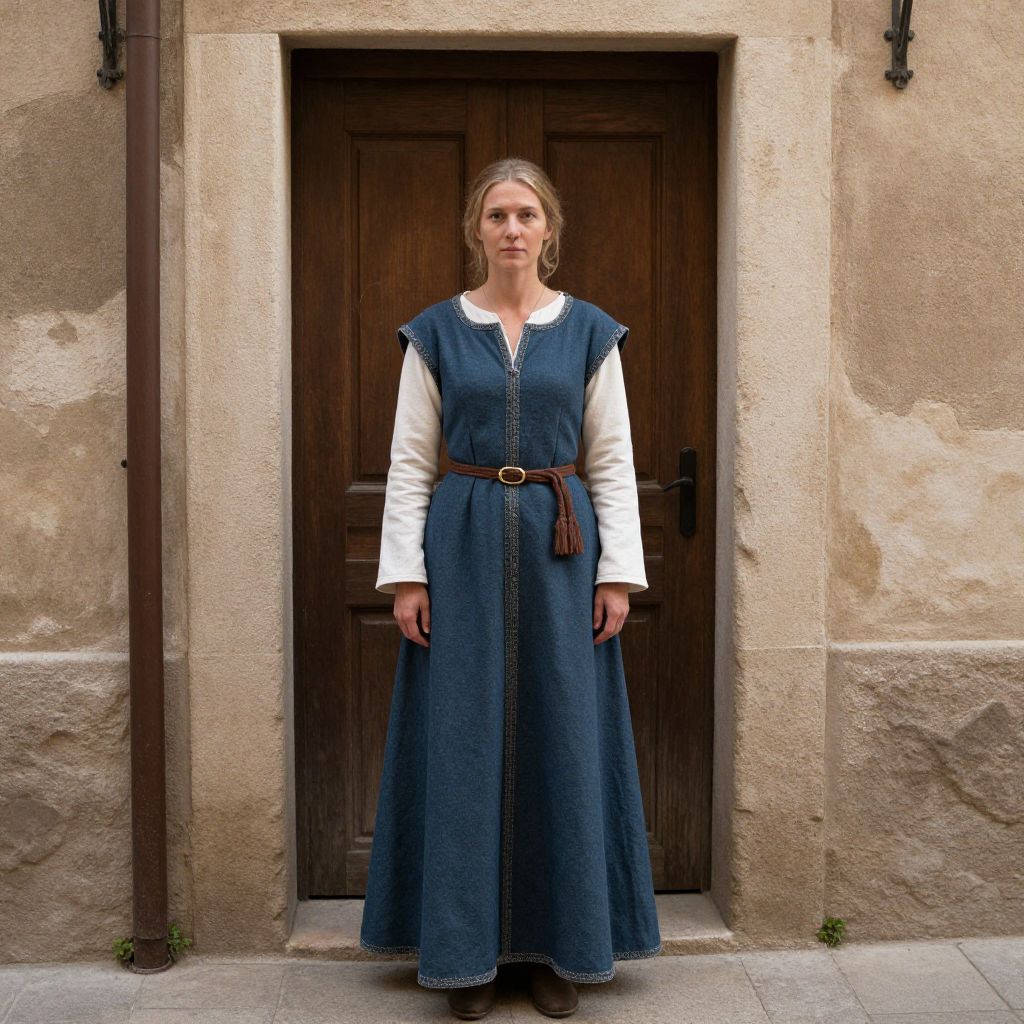 Medieval peasant garb, woman in medieval dress standing in a narrow alleyway with a wooden door