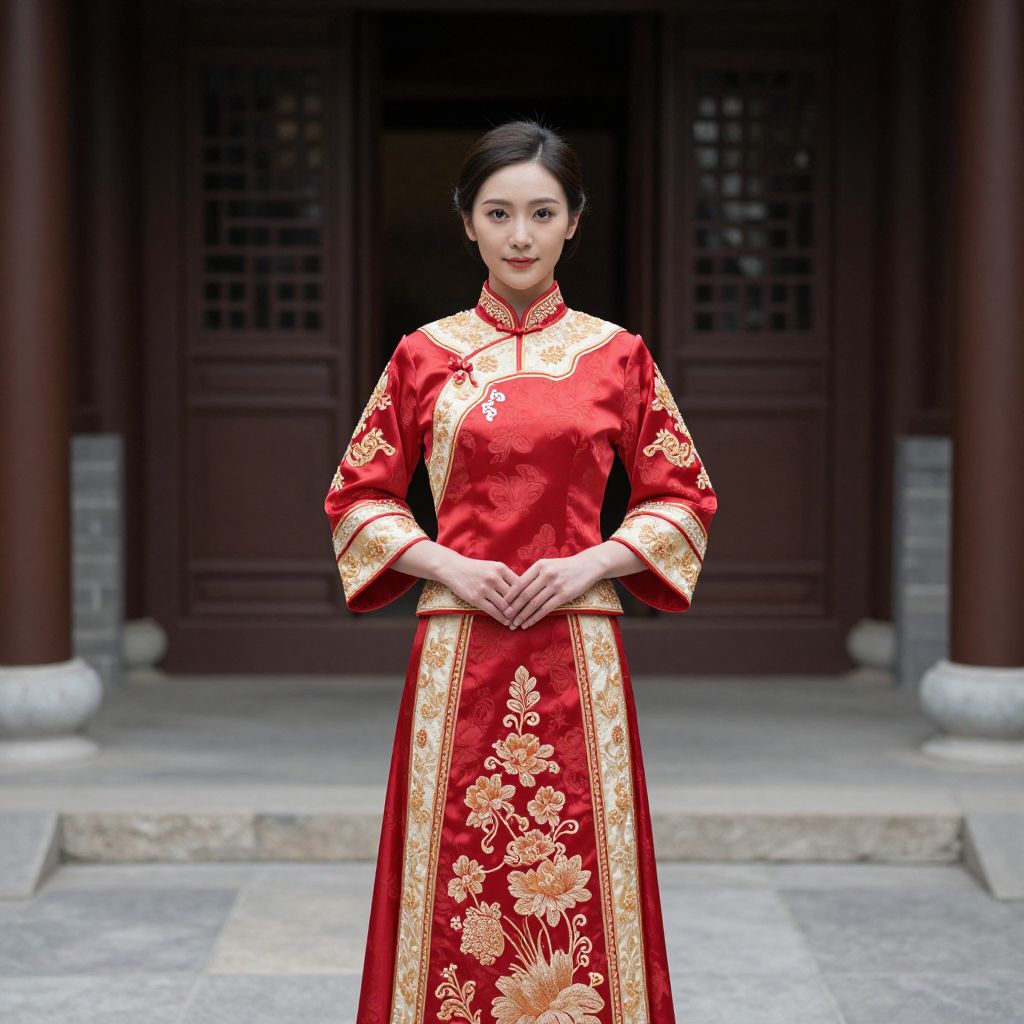 Asian Formal Wear, asian woman in a traditional chinese dress standing in front of a building