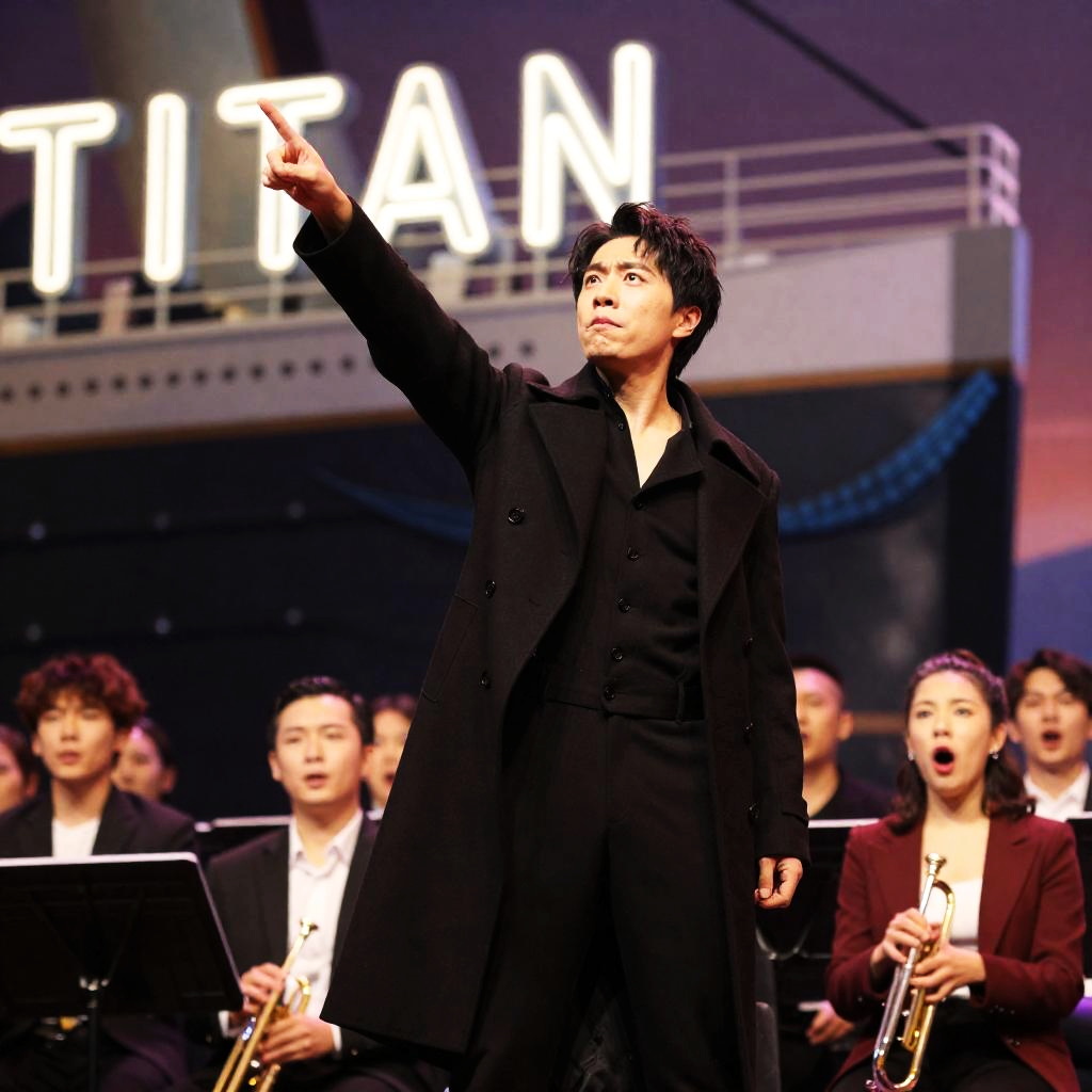 Photograph of a stage performance. Central figure in long black coat, outstretched arm, pointing upward. Background neon "TITANIC" sign, large statue with blue drapery, vibrant lights. Musicians in foreground, one holding trumpet. Multiple people, intense expressions. Bright, colorful, dramatic lighting.