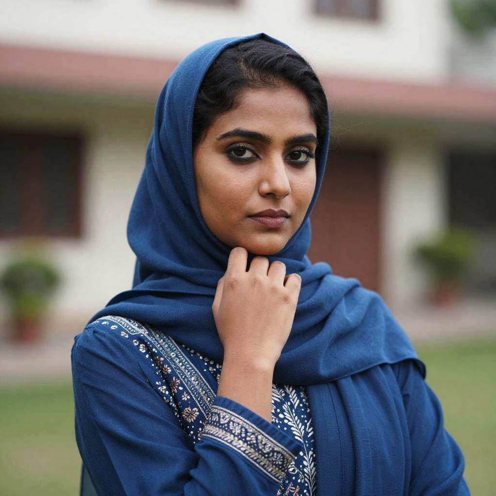 Photograph of an attractive South Asian woman with medium brown skin, dark hair, and striking features. She's wearing a blue hijab and a matching traditional dress with intricate patterns on the sleeves. Her right hand is gently touching her chin, and she's looking directly at the camera with a calm, confident expression. The background is softly blurred, showing a building and some greenery.