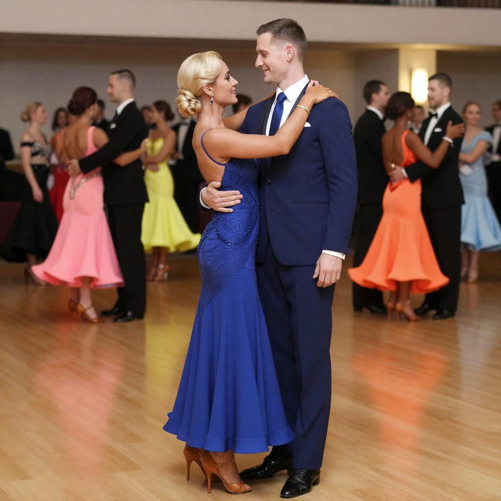Photograph of a formal dance event. A man in a blue suit and black shoes, with short brown hair, holds a blonde woman in a blue, sparkling gown. They stand close, smiling, with a group of people in colorful dresses and black suits in the background. The setting is an elegant, brightly lit hall with wooden floors.